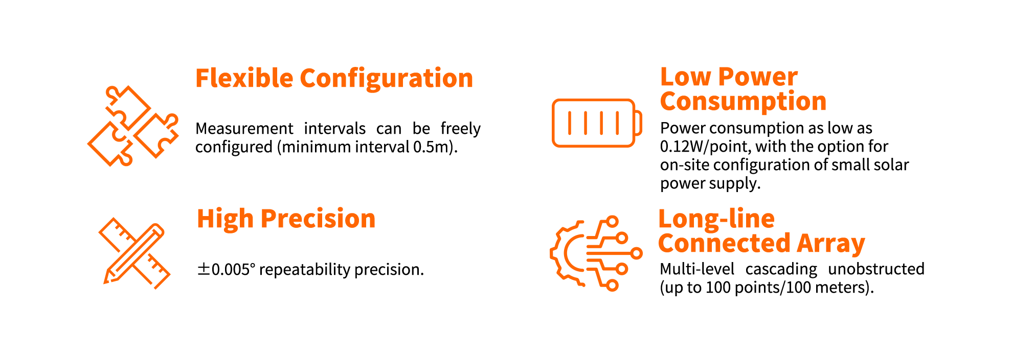 The in-place inclinometer system is composed of multiple inclinometers connected in series according to a preset spacing. It is primarily used for long-term automated monitoring of deep horizontal displacements in scenarios such as slopes, dams, and deep foundation pits. During long-term monitoring, if there is horizontal deformation within the structure, the system can automatically calculate the horizontal displacement at different depths by comparing the initial measured angle and the current real-time measured angle of different depth inclinometers, there by providing early warnings to prevent accidents.