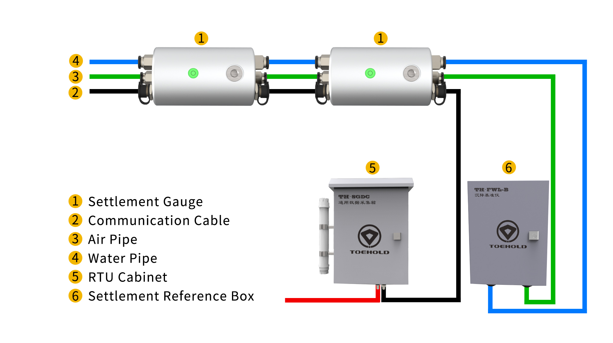 The integrated settlement and inclination measurement system mainly consists of an integrated settlement and inclination gauge (equipped with built-in pressure and inclination sensors), connecting cables (including data bus, water pipe, and air pipe), an settlement reference box, and a RTU cabinet.