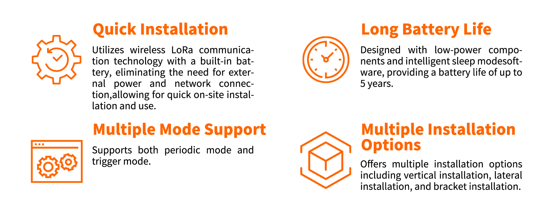 The product features an integrated design with a built-in battery and wireless LoRa transmission module, allowing for rapid installation and use in situations where power supply and network access are inconvenient.