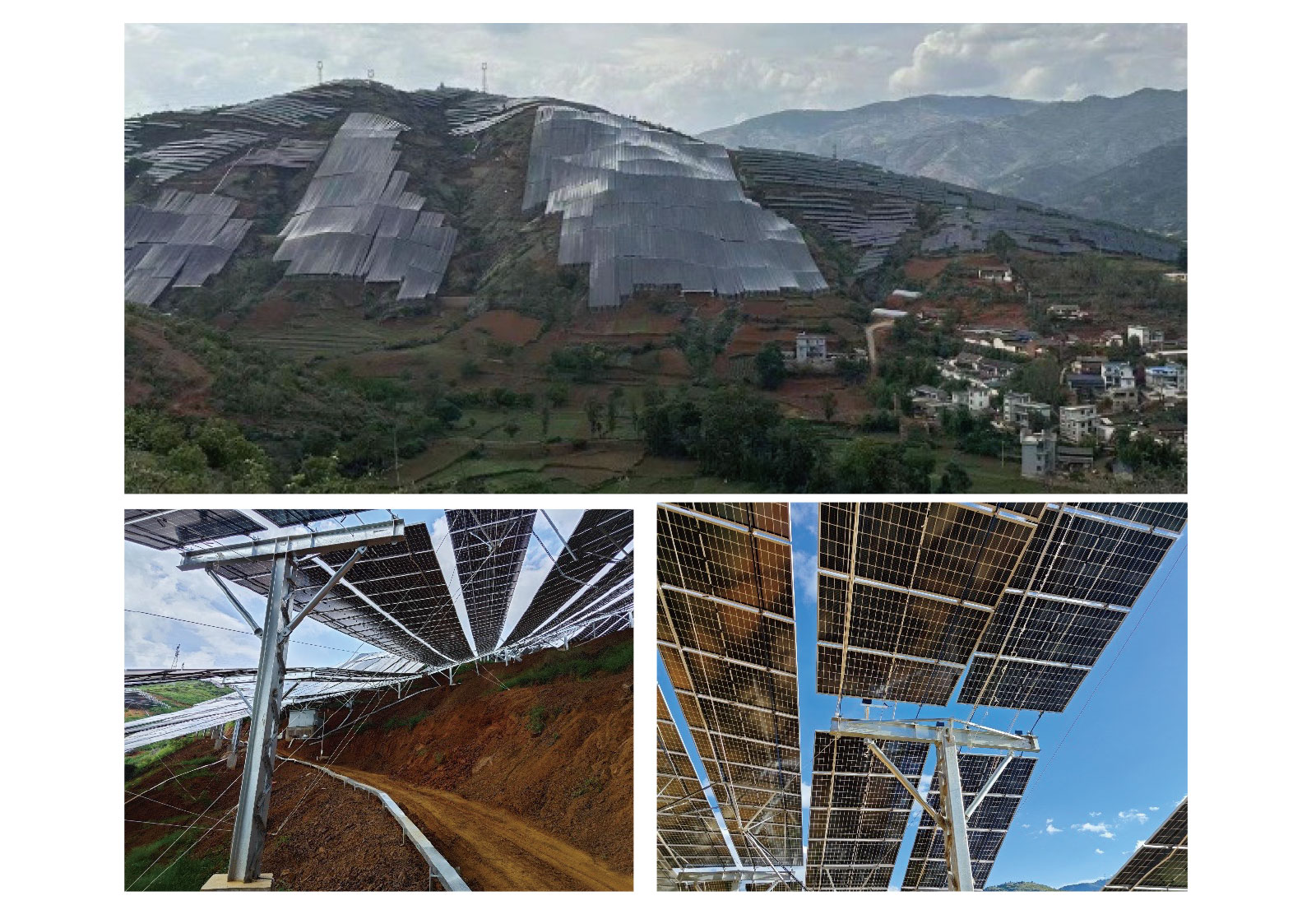 The module supports of this photovoltaic power station adopt a three-cable structure flexible support, which is installed with a fixed inclination angle and following the terrain slope. The total length of a single set of flexible supports ranges from 180m to 400m, with a height difference of 60m to 140m. The overall slope is between 19° and 28°, and the local slope exceeds 35°. The single-span range is mainly 30m to 60m, and the column height range is mainly 2.5m to 5m. The nominal diameter of the cable strand is 17.8mm.