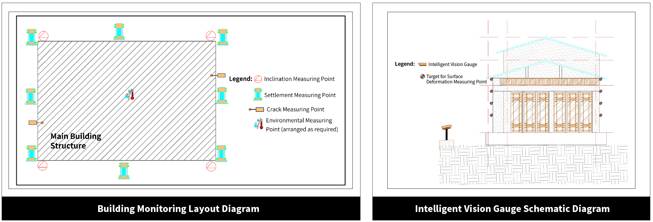 Structural monitoring of building constructions should focus on deformation monitoring, which boasts the advantage of "high measurement accuracy" and enables effective data analysis to reflect the structural health status. Deformation measurement includes the monitoring of "settlement" and "inclination". Meanwhile, structural cracks will reduce structural stiffness, which in turn leads to increased structural deformation. Therefore, "cracks" are also an important monitoring item in building monitoring.