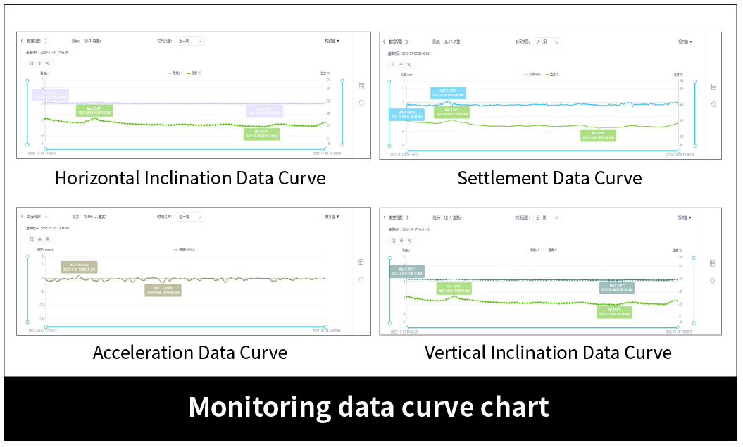 For some buildings affected by surrounding construction activities, vibrations may cause fatigue damage to the buildings. In such cases, environmental monitoring items such as "vibration", "wind speed and direction", and "temperature and humidity" can also be monitored.