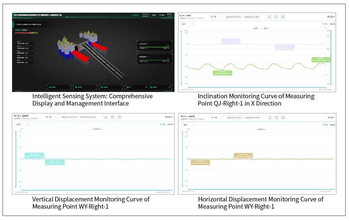 Through the construction of the safety monitoring system, high-precision real-time collection and transmission of safety monitoring data, 3D intelligent display, and full-life cycle statistical analysis of the high-speed railway concrete mixing plant have been realized, achieving the effect of intelligent perception and intelligent management of the structure's safety. Since the equipment was put into operation, the values of each measuring point have remained stable, and no obvious abnormal changes have occurred in the horizontal/vertical displacement of the conveyor belt and the inclination of the material storage tank. The mixing plant facilities are in a healthy operating state.