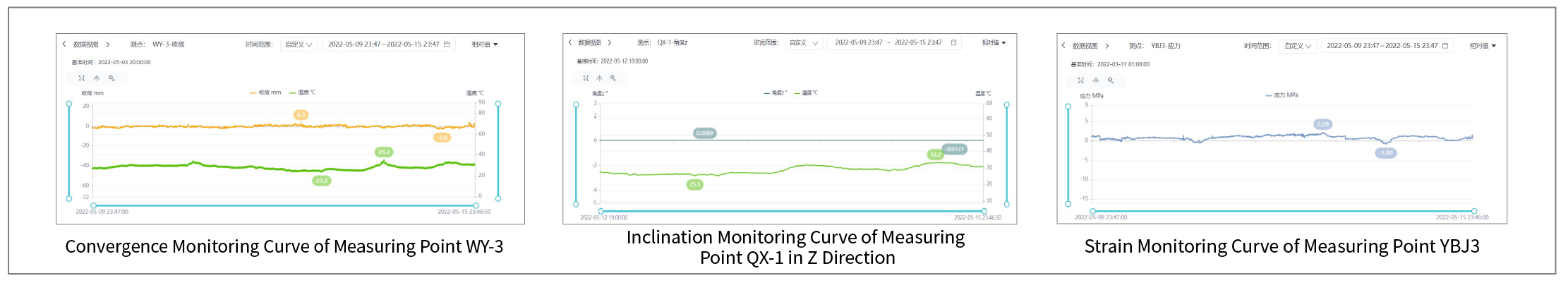 In this project, 4 inclinometers, 4 laser convergence gauge and 8 string-type surface strain gauges are used to monitor the inclination, displacement and axial force of the columns respectively. Additionally, an acoustic-optical alarm is installed near the monitoring area to provide on-site acoustic and optical alarm assistance.