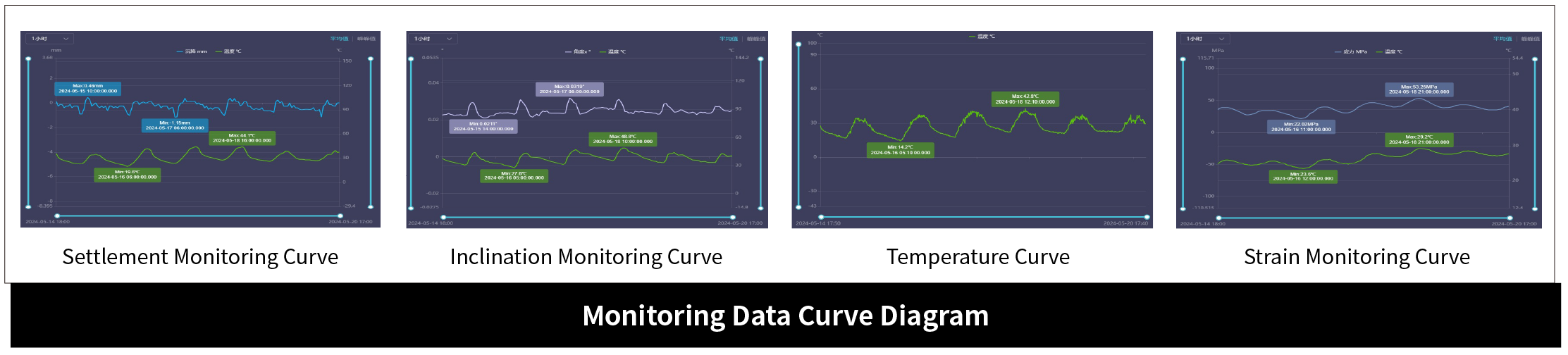 For some buildings affected by surrounding construction activities, vibrations may cause fatigue damage to the buildings. In such cases, environmental monitoring items such as "vibration", "wind speed and direction", and "temperature and humidity" can also be monitored.