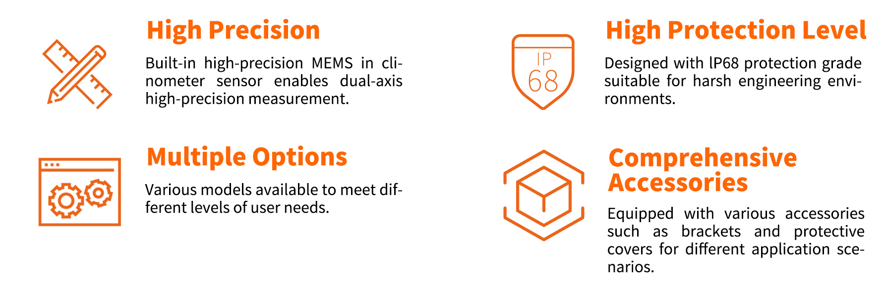 The tiltmeter integrates a high-precision MEMS in clinometer sensor along with corresponding data acquisition circuits and data processing algorithm, outputting tilt data via an RS485 interface. It can measure multiple-axis tilts simultaneously. This product is installed on the surface of structures and can be applied for the inclination monitoring of slopes, dams, buildings, bridges, tunnels, and underground utility corridors.
