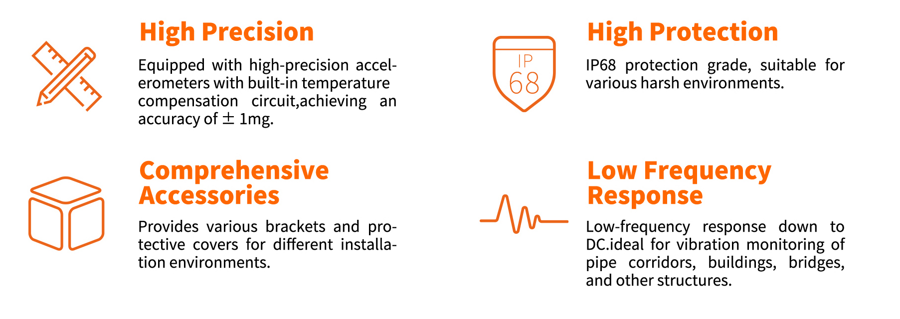 This product is installed on the surface of structures and can be used for vibration monitoring of buildings bridges, tunnels, pipe corridors, and dams, as well as cable force monitoring of bridges.
