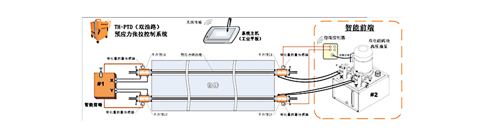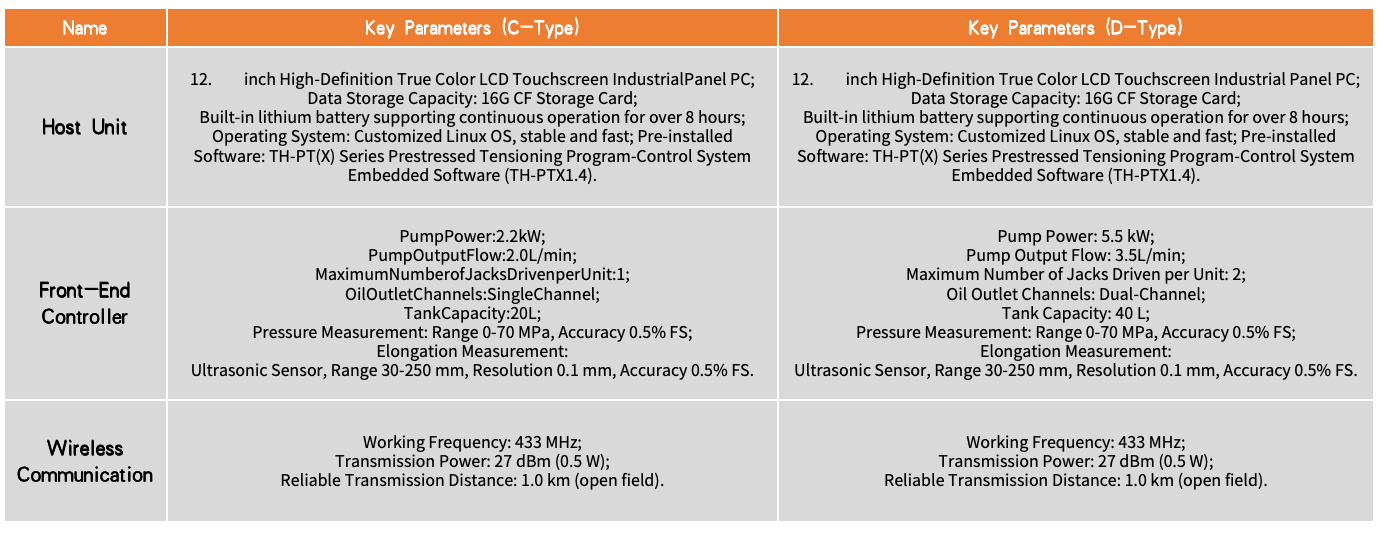 The prestressing tensioning program-control system consists of a program-control host unit and an operation front-end. The operation front-end includes: measurement and control circuits, an oil pump, hydraulic jacks, sensors, and other components. The D-Type is the flagship system, which utilizes a dual-circuit numerically controlled oil pump capable of simultaneously driving four hydraulic jacks to achieve symmetrical tensioning of two steel strands.