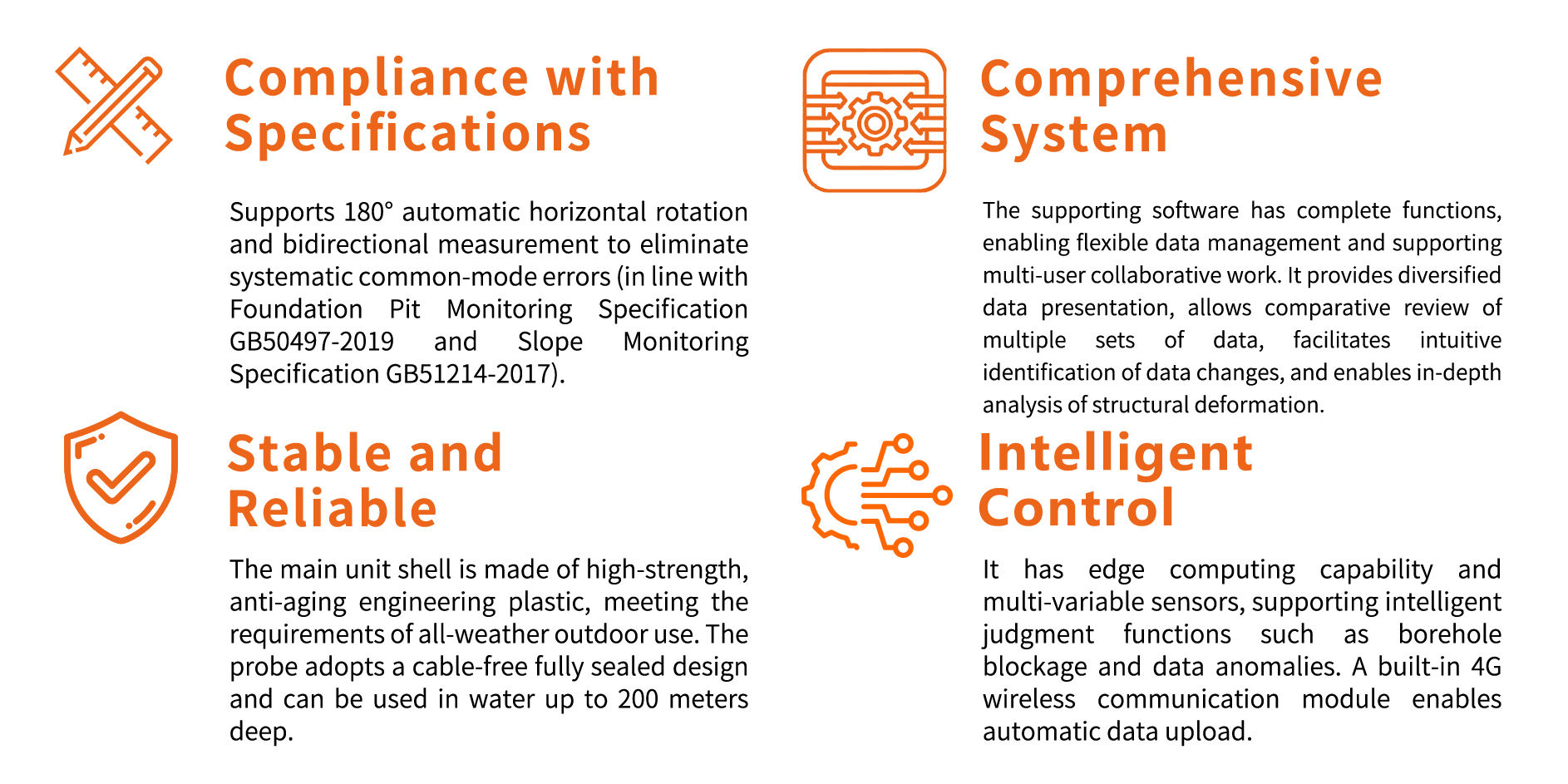 The fully automatic inclinometric robot is a new type of deep horizontal displacement measuring instrument. Composed of a lifting device, a rotating device, and an inclinometric probe, this robot enables fully automatic measurement of deep horizontal displacement and transmits data to local handheld devices (such as tablets or mobile phones) or remote cloud platforms. Users can view data and conduct historical data analysis in the corresponding clients. It can replace traditional instruments like fixed inclinometers and manual inclinometric equipment, and boasts advantages including low comprehensive cost, time and labor savings, as well as safe and reliable data.