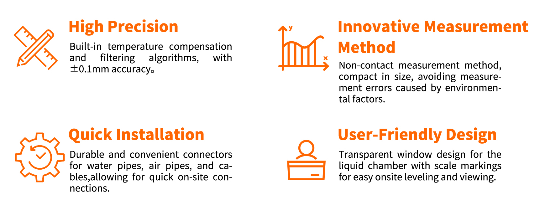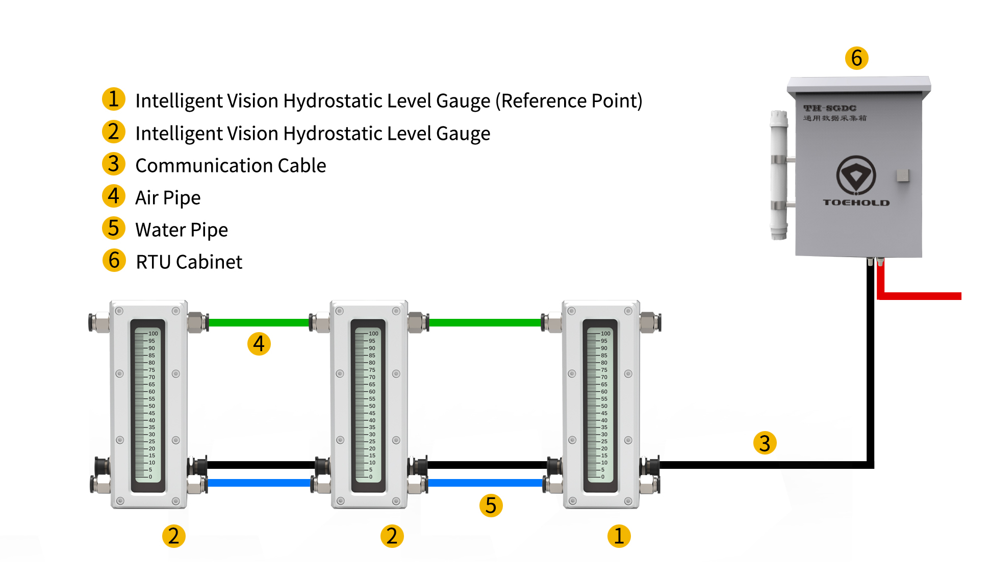 The intelligent vision hydrostatic level gauge, equipped with a CMOS line-scan camera, can directly detect the position of the liquid surface boundary and output the liquid level. Then all the levels will be transmitted to the platform which calculates the relative settlement of the structure.This intelligent vision hydrostatic leveling system consists mainly of hydrostatic level gauges (measurement points), connecting cables (including data buses, water pipes, and air pipes) and RTUs . The hydrostatic level gauges can be attached to the structure to measure elevation data along all the measurement points.This product is installed on the surface of the structure and can be used for settlement monitoring of dams,tunnels,buildings, and other structures.