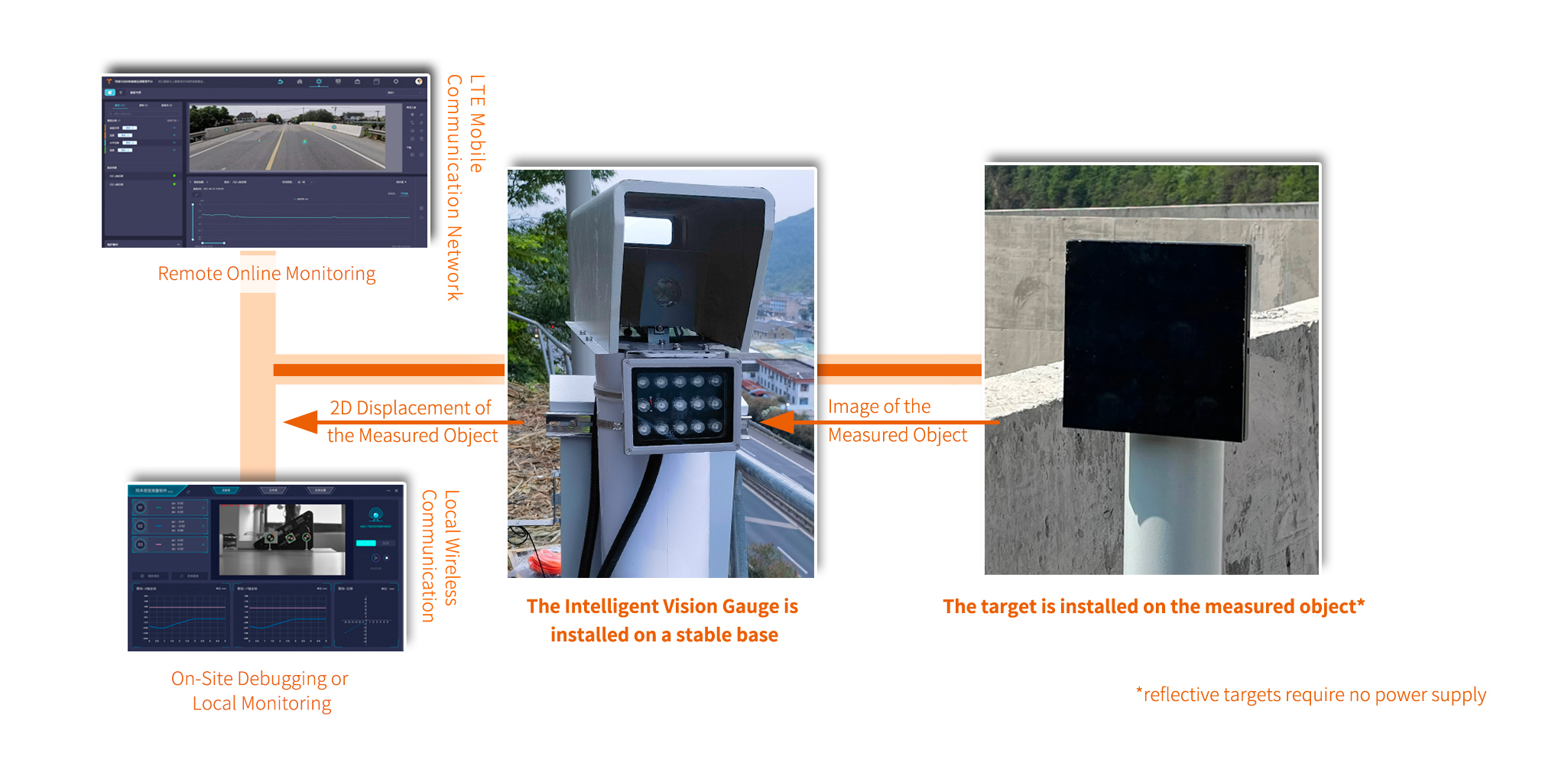 The intelligent vision gauge system uses IoT technology and intelligent disaster identification algorithms to convert image data into deformation data, achieving ultra-high precision, non-contact real-time measurements of various civil engineering structures. This enables long-term monitoring of structural health. The system consists of intelligent vision gauges, targets, on-site configuration software, and the TOEHOLD Sensing Cloud (a structural health monitoring management platform).
