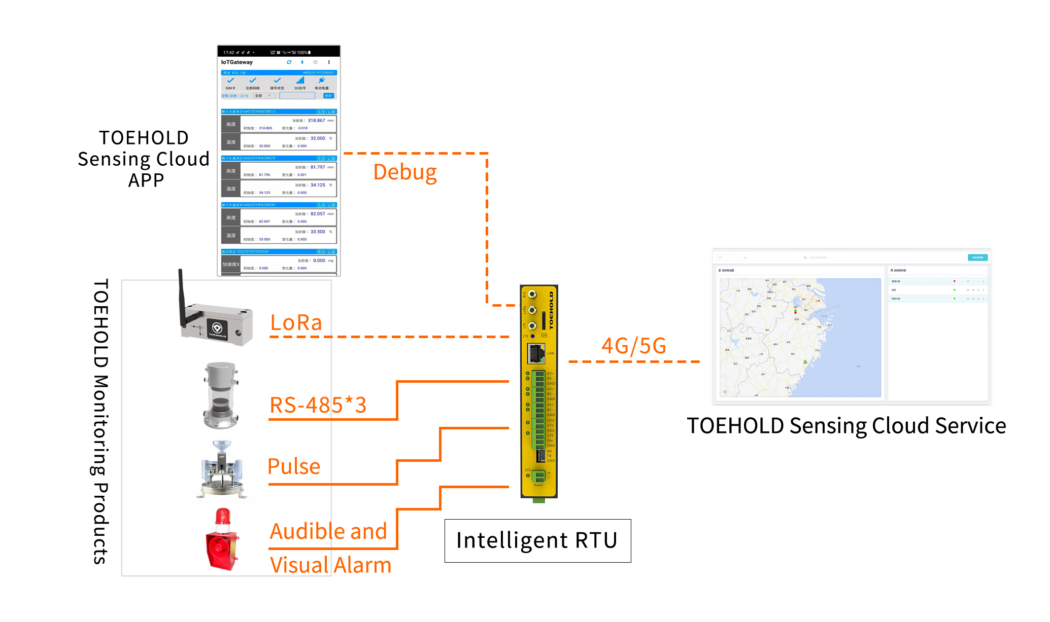 The RTU supports network protocols such as TCP, HTTP, and MQTT, complies with the "China Geological Disaster Monitoring Communication Technical Requirements.", and can be connected to platforms including the TOEHOLD Sensing Cloud (a structural health monitoring platform), China Mobile IoT OneNet Platform, and various provincial-level geological hazard prevention and control monitoring platforms. It can also support customized connection to other protocol-compliant platforms.
