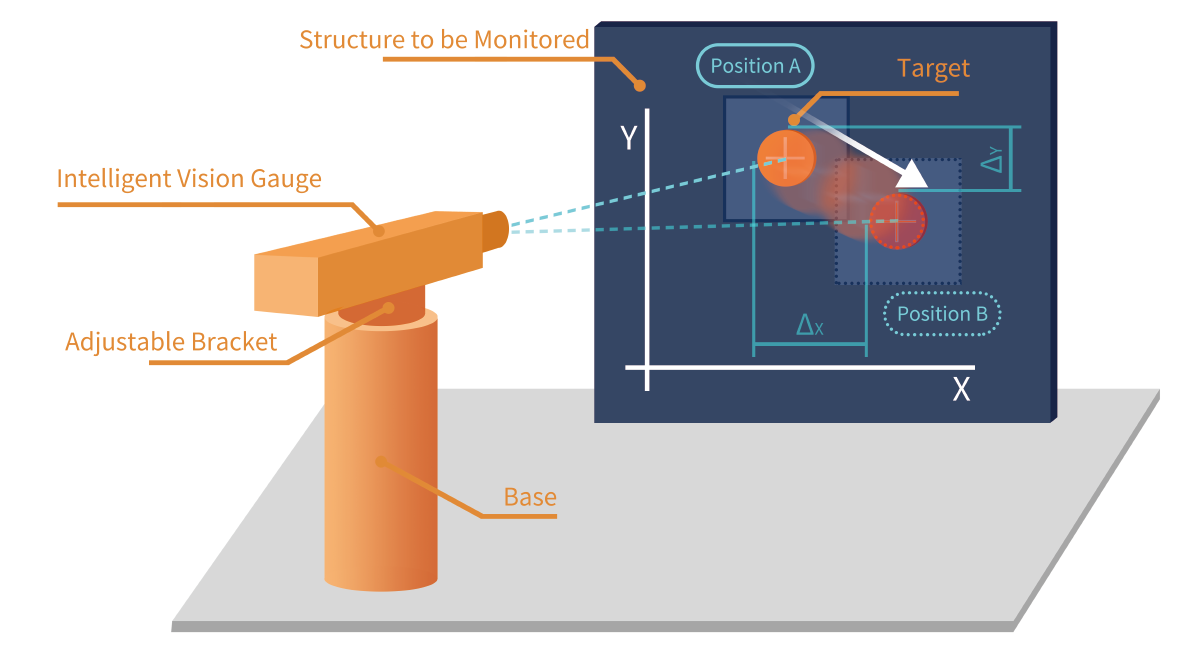The Intelligent Vision Gauge contains an embedded computing module that processes images of targets, corrects target displacements, and improves the accuracy of structural displacement monitoring. It also utilizes dynamic local windowing algorithms to solve large computational volume problems, allowing all monitoring data to be processed and computed locally within the embedded computing module.